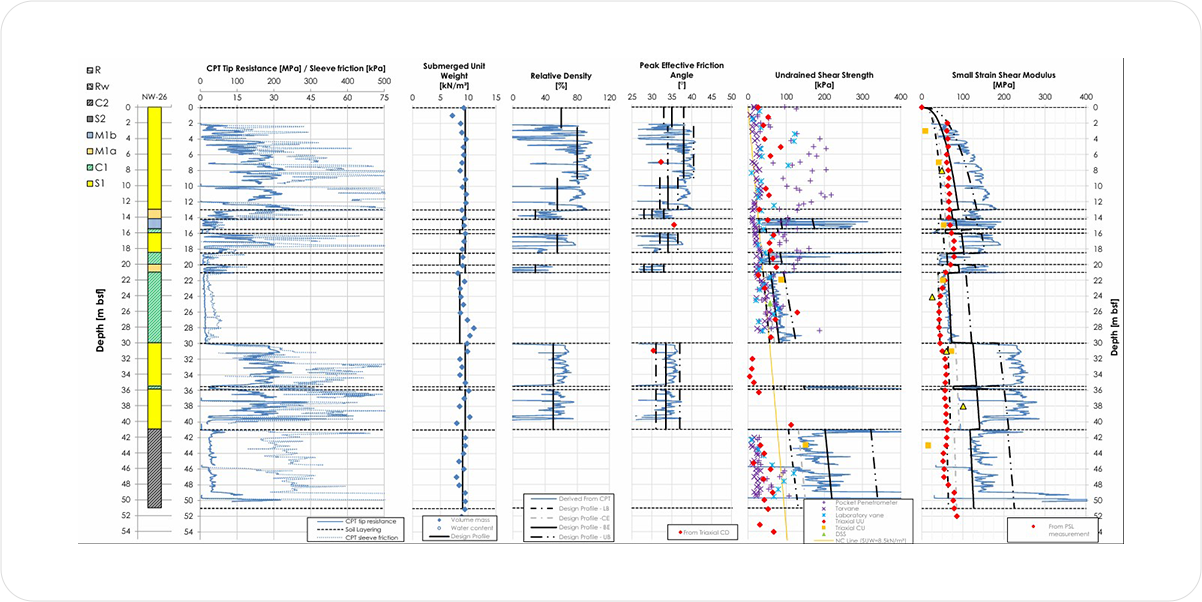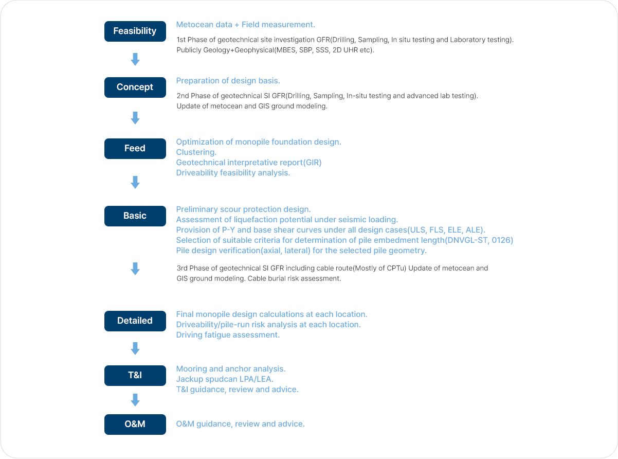 해상풍력단지개발 동안 해상지반공학 관련 업무 범위는 WTG 기초설계를 위한 GIR, 그리고 지반설계에만 국한되지 않습니다.