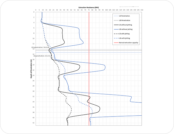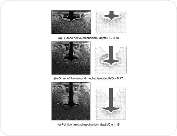 모노파일 운반 및 설치 시 발생할 수 있는 가장 흔한 문제 중 하나는 두껍고 연약한 점토/실트지반에서 spudcan 의 관입/인발로 인한 설치선박과 기초주변의 세굴방지공의
