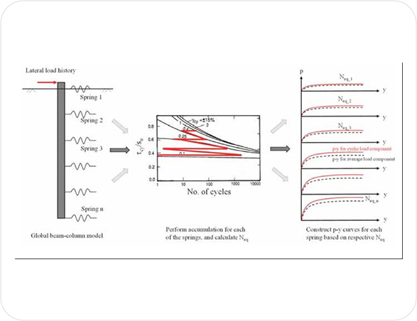 특히 모노파일은 말뚝의 주변마찰력으로 지지되며, 설계수명 동안 반복하중 (파도, 블레이드 등)으로 인해 인접 지반의 강도가 저하되므로 토질역학 분야에서