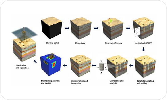 The data from the available cross-sections, existing geotechnical investigation report and results from the upcoming geotechnical investigation at WTG locations will be integrated to determine the stratigraphy and geotechnical parameters per each soil units at each envisaged turbine location. Typical Geotechnical Interpretative Report (GIR) suitable for offshore wind foundation design purposes shall include.